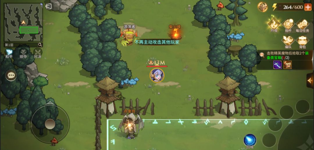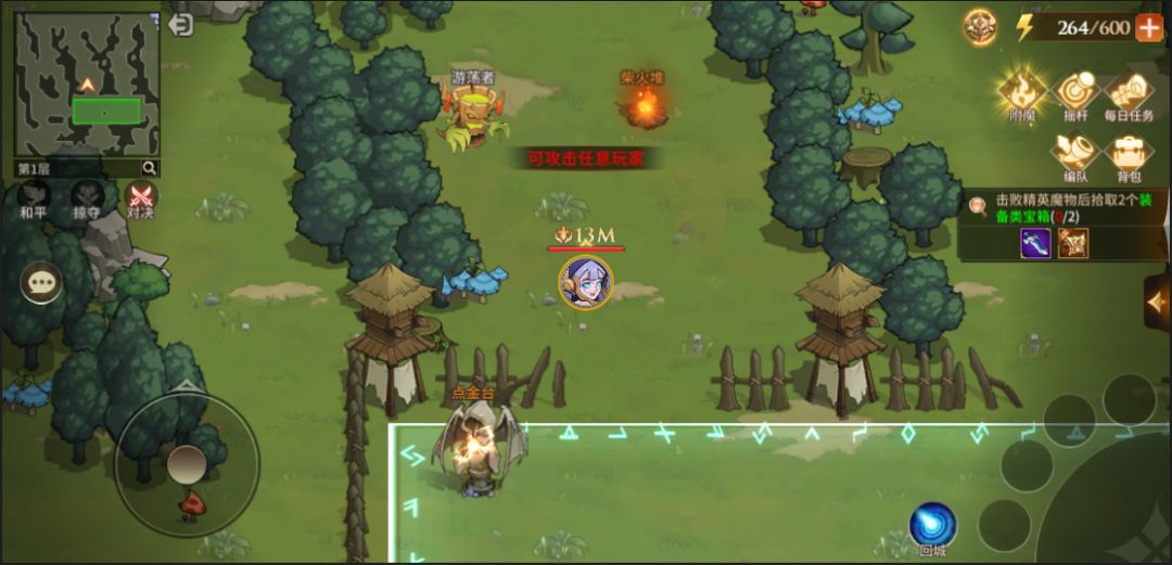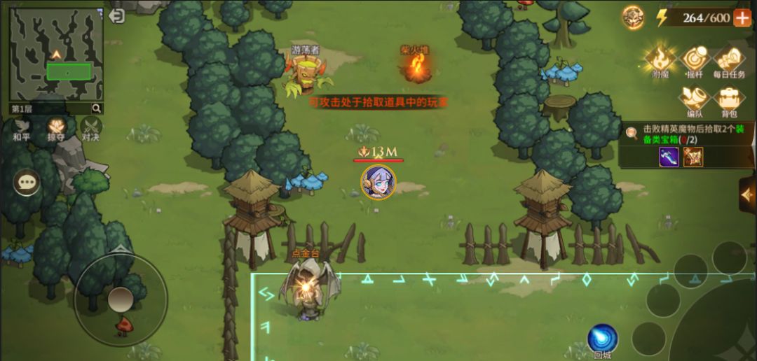 【玩法介绍】进入迷雾森林完成新手引导后,我们可以看到这个界面。右上角移动方式<摇杆>点击可切换成<点击>(艾丽建议,<摇杆>比<点击>好用哦~)。