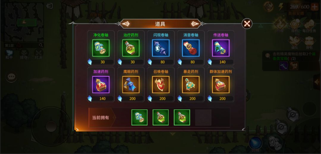 7- 道具栏在屏幕右下方,一次只能携带四个,所携带的道具包含地图内拾取和商店购买两个途径获得的道具。就道具的实用性来说艾丽钟爱<闪现卷轴>和<鹰眼药剂>,(*^▽^*)。