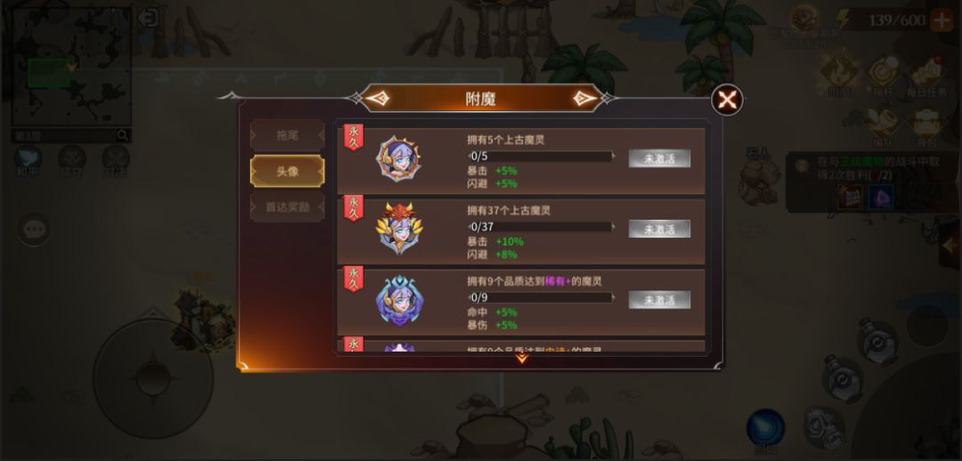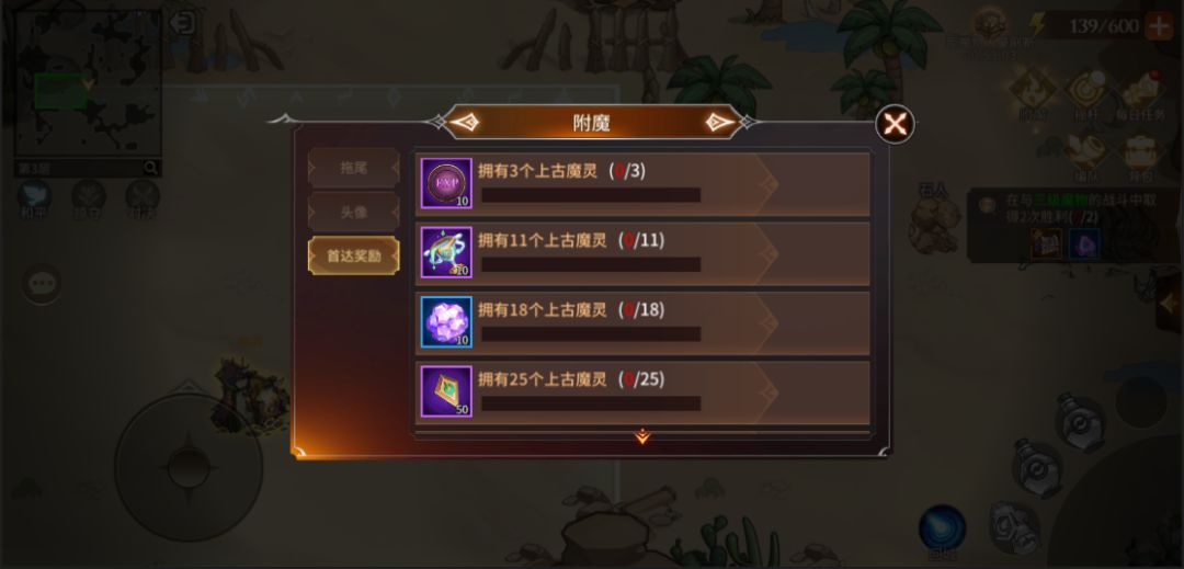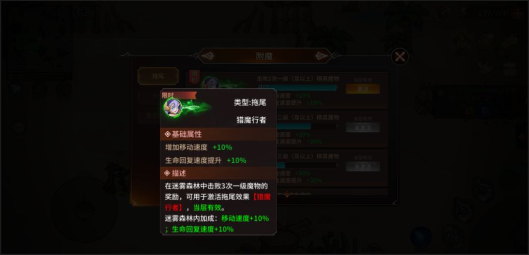 此处简单说说附魔按钮,附魔功能内包含“拖尾、头像、首达奖励”三个功能,每个功能包含不同的目标,通过参与迷雾森林活动,达成对应条件后即可获得对应的加成属性和奖励。