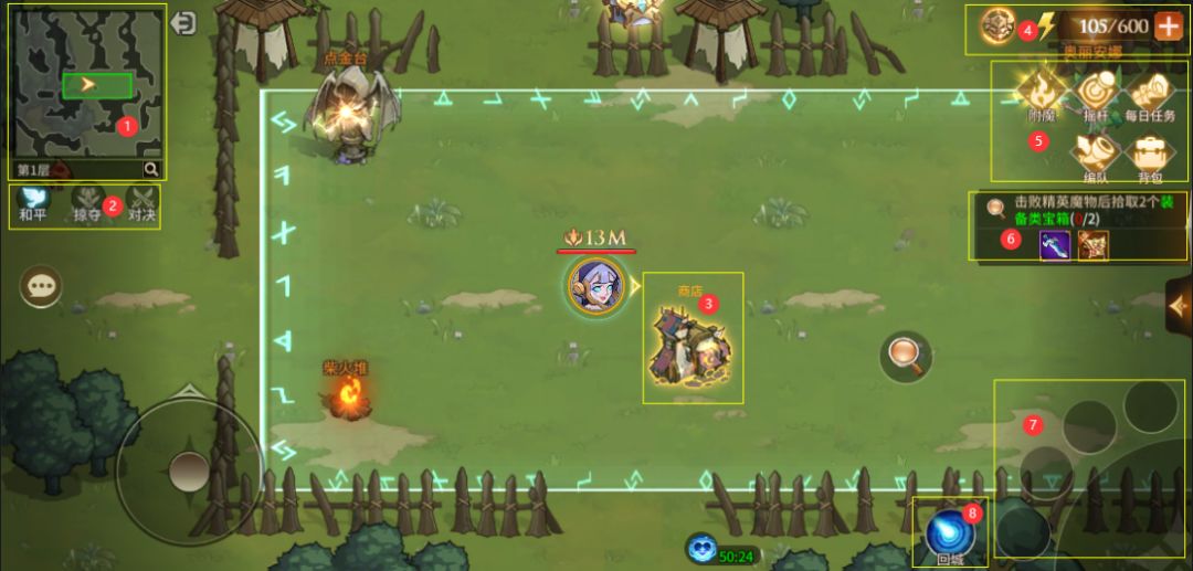 5- 各大功能<控件>区域,其中包含:附魔(拖尾、头像、首达奖励)、操作模式切换键、每日任务、编队、背包(注:此背包为迷雾森林背包,退出迷雾森林后将自动放置主界面背包中)