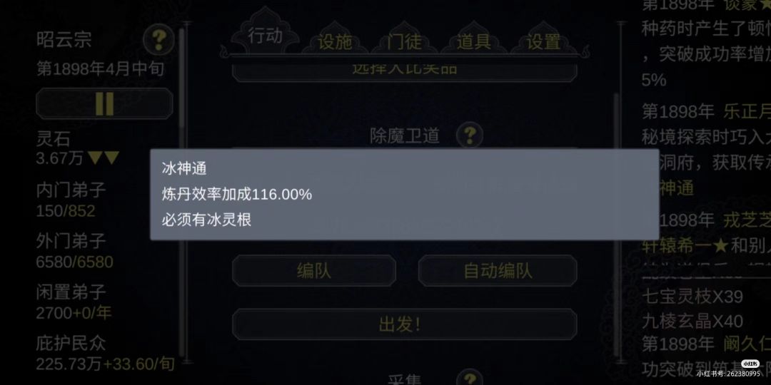 作为掌门的你,首先就是在“行动”页面不停除魔、采集灵草灵矿、炼制灵丹法宝。