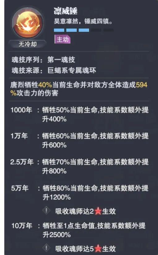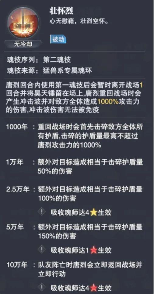 结合则是唐烈在PVP中的实测情况,因为测试服的真人PK战斗并不是那么好找,所以目前大致的测试结果是唐烈的PVP强度还是不错的,特别是在破盾输出方面会拥有非常有价值的体现,具体魂环配置可以考虑2122,加点攻击or暴伤,其输出逻辑主要是靠开局6星魂骨的4技能自动释放先来一波输出(当然如果你觉得自动释放1技能就能把对方给干趴下了,考虑22XX的魂环配置也可以),然后轮到唐烈行动时其使用1-2技能【凛威锤】再打一波强势输出,接着凭借2-1被动的离场特效短暂自保,1回合后回到战场还能对全体敌人造成极为可观的破盾+群体输出,这三波输出过后......基本上对面也就遍地残血了。