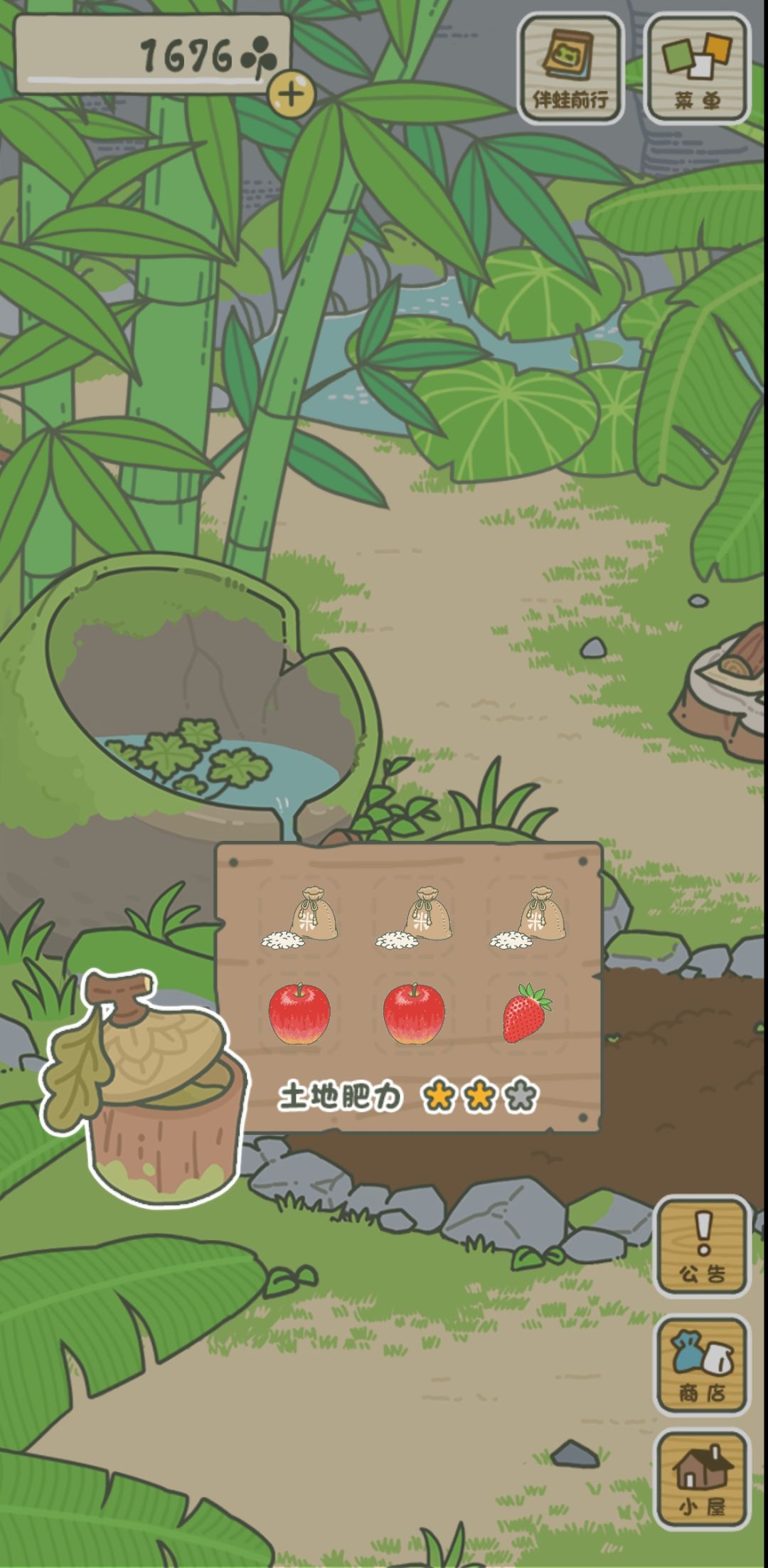 希望能快点和别家一样开出好看的花花,要是能让三叶草增产就最好了,我现在最大的问题就是穷,穷得叮当响。别说锦鲤了,锦鲤现在都不在我的考虑范围之内,我连睡垫都还没买,围巾水壶纸伞只买了最贵的那一个,买不起多的;家具图纸之前糊里糊涂买了11张;便当和手工材料都是掐着点用完了才买没有库存,偶尔抽奖抽到吃的又可以给蛙拿出去混一次
