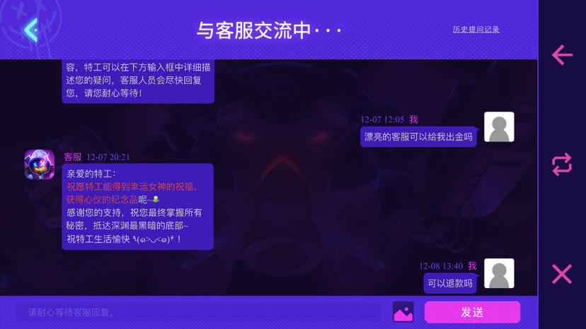 今天下午我问客服能不能退款,然后大概4点多的时候攒了五抽出了一金一紫(天使号角和2077),当时太激动忘了截图了