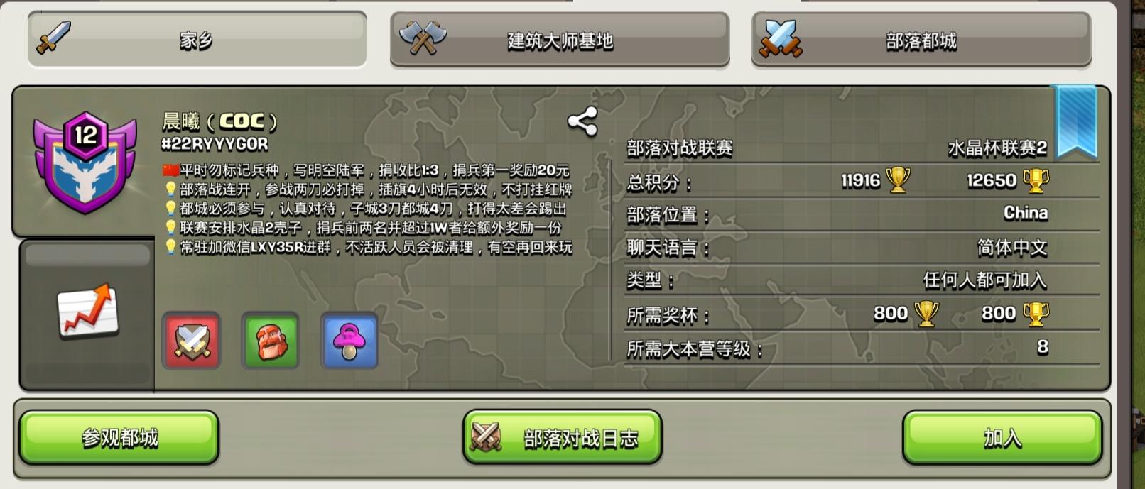12级部落招人,联赛有壳子混,五级都城,#22RYYYG0R ,捐兵有奖励,部落战连胜,需要一些爱打部落战的人过来