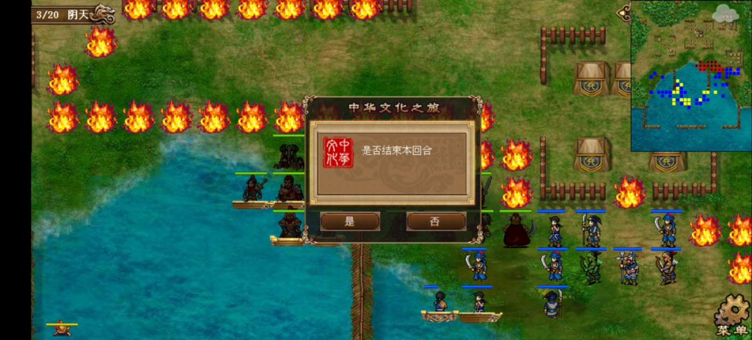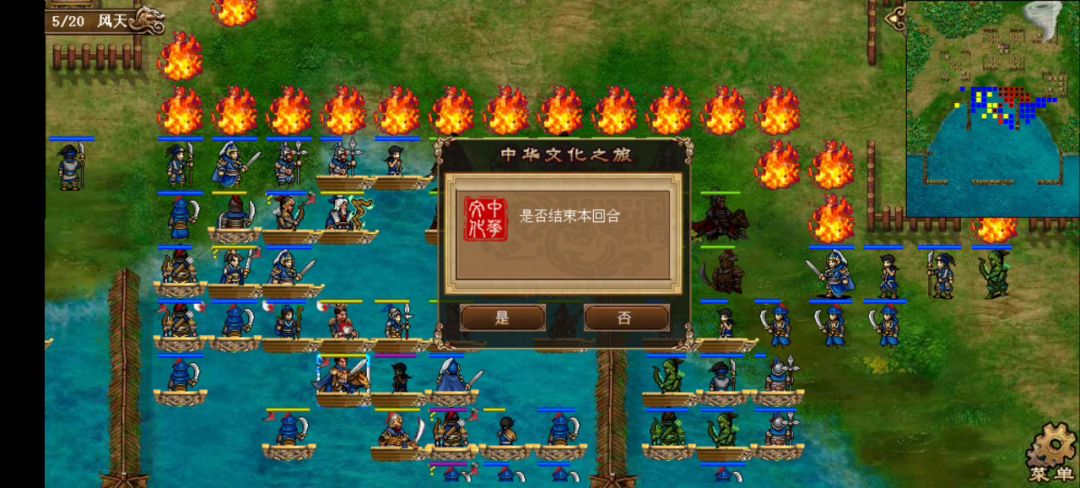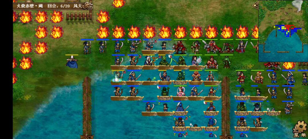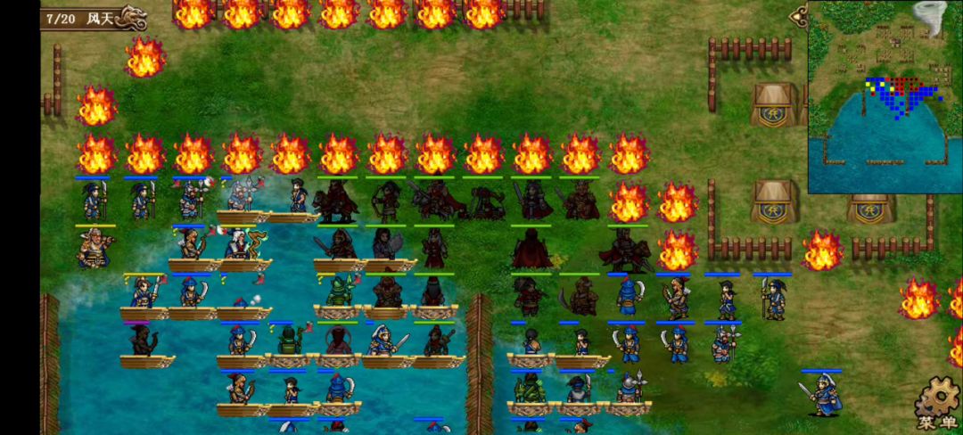 经典战役,难度也是非常高,吴军黄名成群结队,神器装备率也高,组合起来非常厉害。敌军攻击方式立体,物理法术都有,近中远程皆全。杀20个敌军后扑灭后方的火,朱恒带着之前击退的小兵出现,周仓廖化带人从后方出现截杀。