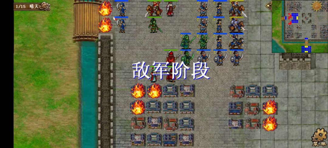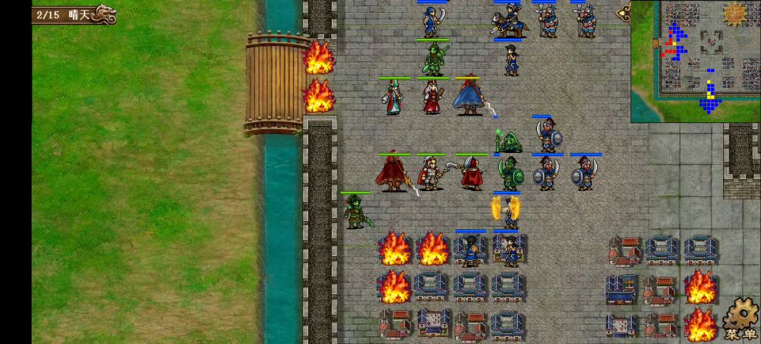 (堵门的好处在于能够把稍微远程一点的敌军都堵在营内出不来两侧围过来的敌军攻击范围都只有贴身8格,很容易控制好我军的挨揍次数)