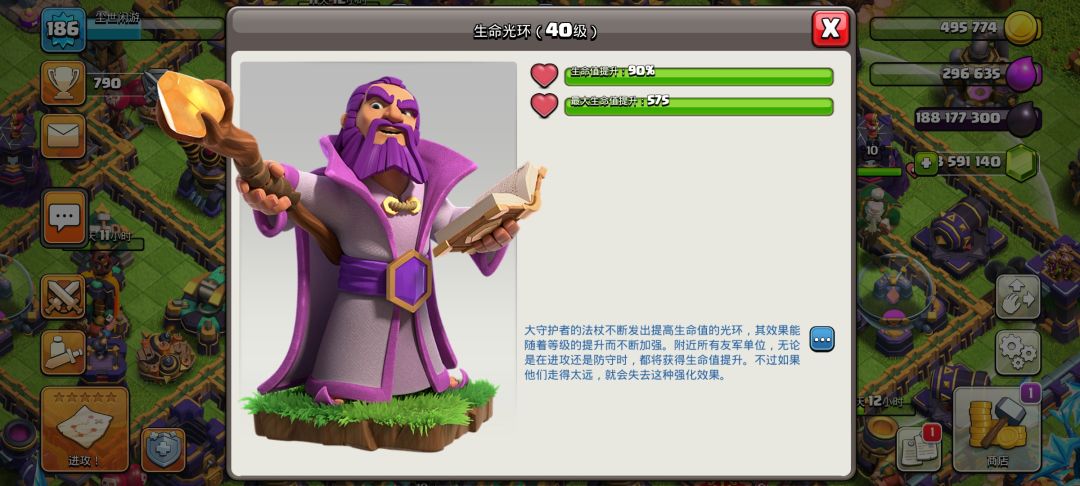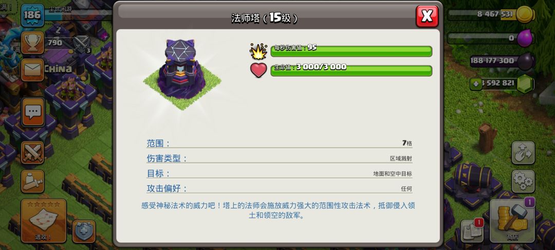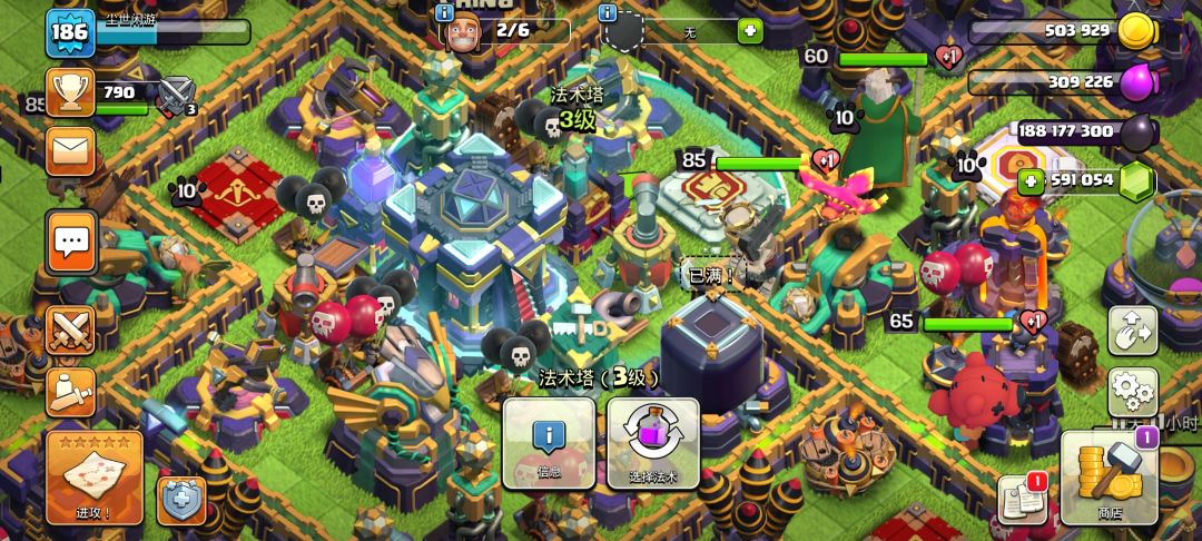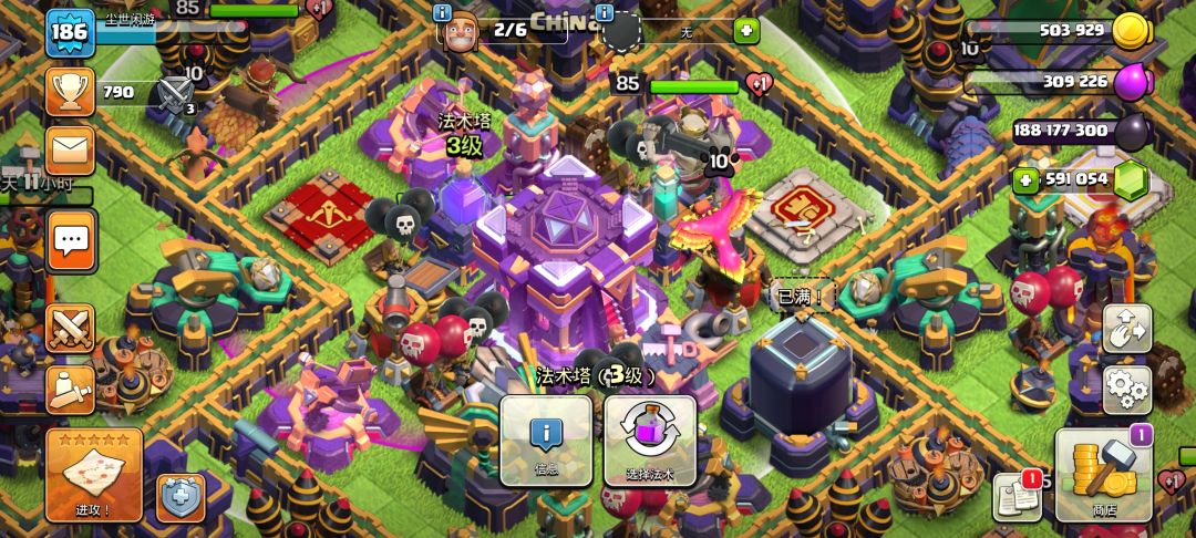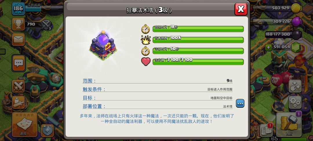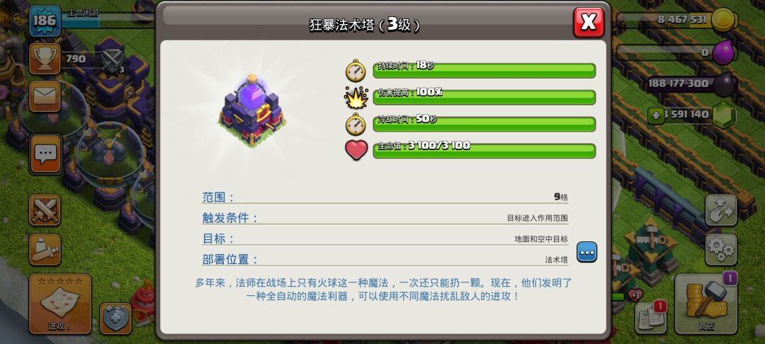 第一个就是狂暴法术塔,可以使紫色圈内的建筑及大本营提高攻击时的伤害,由于有时间限制可以放在大本营旁边的重要且伤害较高的防御建筑之间,尽可能让防御建筑吃到buff。