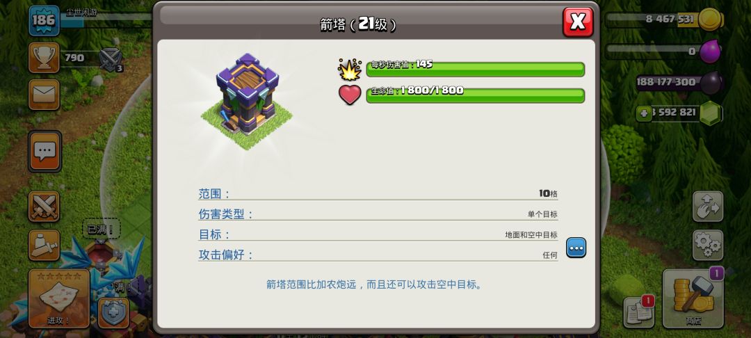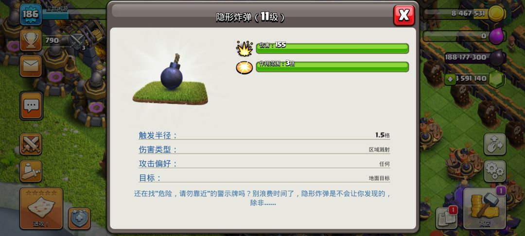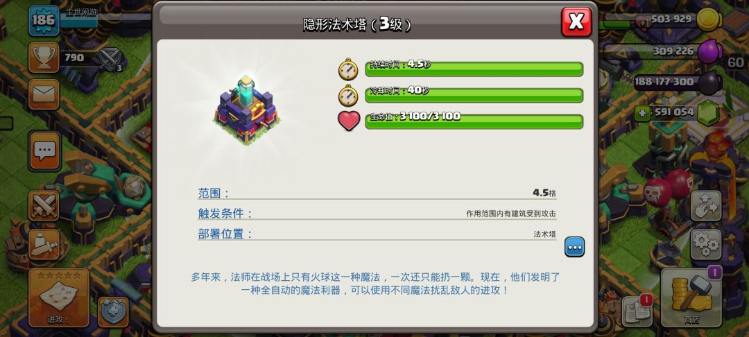 第三个是隐形法术塔,这个就厉害了,可以将周围的所以建筑都隐形并且无法被发现和隐形药水是一样的,这个推荐放大本营旁边可以防放飞艇爆本也是不错的。