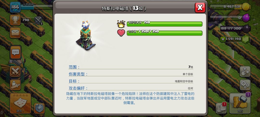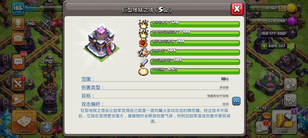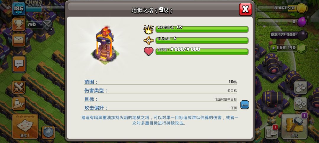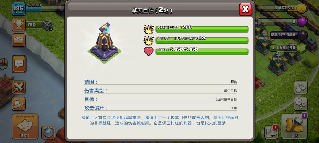 15本新增了个大电塔,可以造成生命百分比伤害也就是生命越高受到的伤害越高,可以放在大本营旁边或者当第四个地狱塔,拦截飞艇爆本可以说是有奇效,升级是用黑油升级,也是部落第一个黑油升级的防御建筑。
