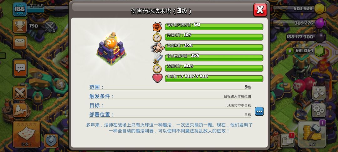 第二个则是伤害药水法术塔,可以对周围的敌人造成减速和增加其受到的伤害,不限兵种。