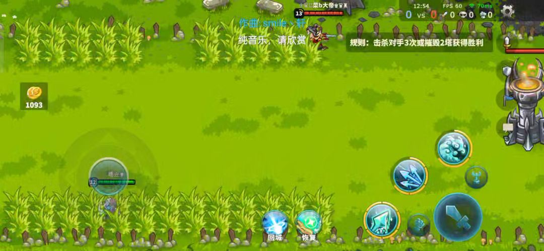 队友选择小胖进入图示位置探草,发现敌方视野的同时将对方钩来。此时在保证图示小胖位置上方未出现敌人的情况下小黑可以使用二技能补充伤害,将二技能末端与敌方重叠,让对方吃满伤害,这样对方一般回不到塔下就会被a死,收获一血。