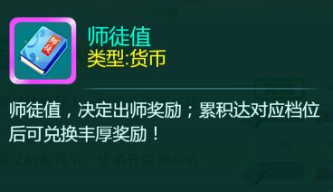 在师父的指导下,徒弟每升5级师徒双方都能获得“师徒值”和“良师积分”奖励