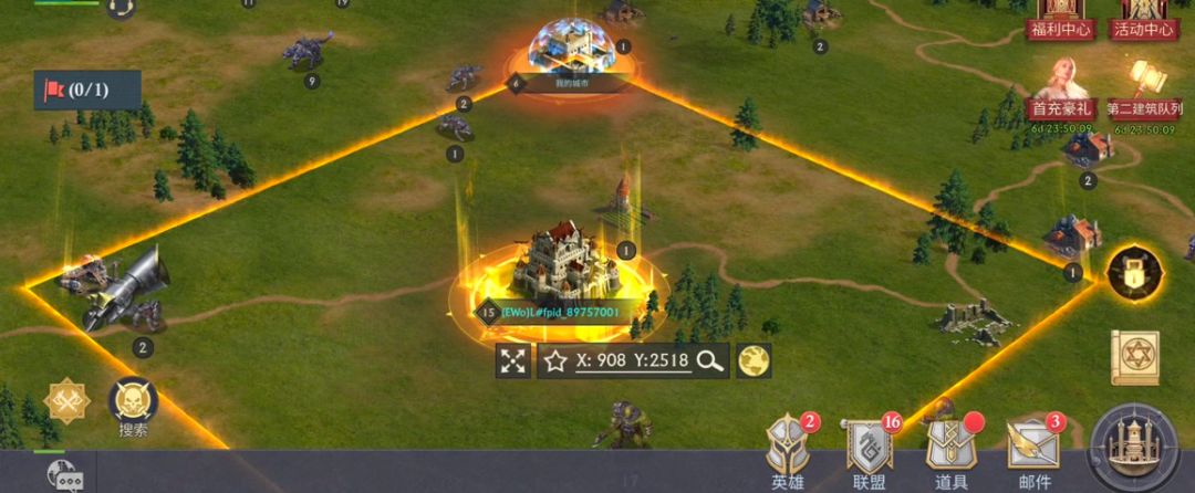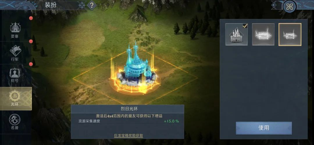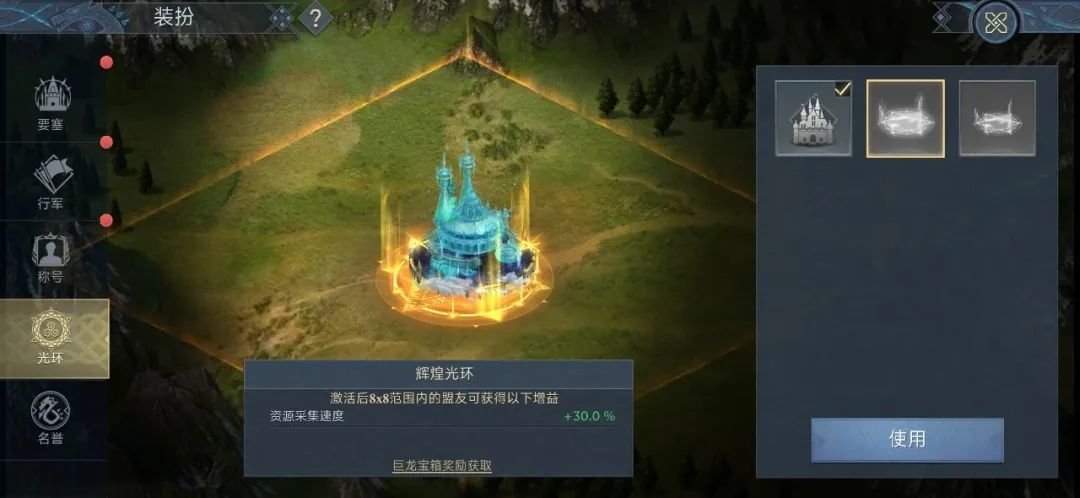 在主城——装扮——光环界面,使用道具后,玩家城堡会在大地图上获得金色光环特效。城堡底部会有多边形金色魔法阵,四周也会有8x8或者4x4方型淡色光芒边缘,彰显领主城堡的独一无二。