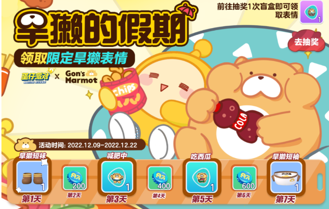 12月9日到12月22日登录就可以领取旱獭为大家准备的丰厚见面礼!舒适的旱獭短袜和短袖最适合北方开暖气的蛋仔们登录和参与抽奖还可以分别获得旱獭的限定表情哦~