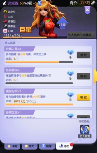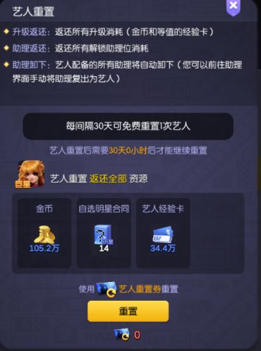 艺人特权:通过完成艺人成就,获得一定的资源,该界面中有【艺人重置】,通过使用艺人重置卡来重置艺人,100%退还资源