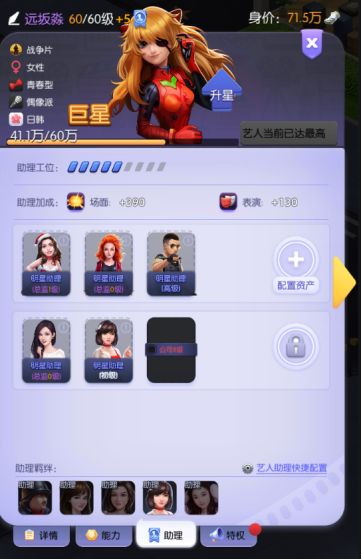 艺人资产:配置艺人资产后可提升艺人的场面和表演属性,同时给艺人带来额外的身价加成,更高的的资产还会带有额外效果,能帮助艺人在怕死和电源中发挥更好