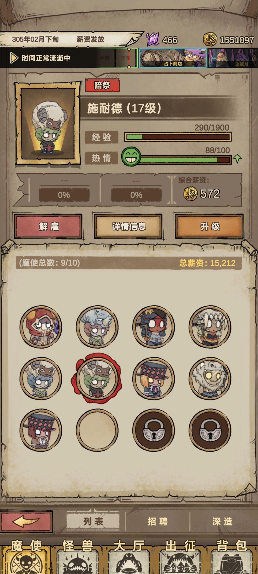 5.把前期白蓝魔使解雇全升一个黄魔使,并在第一年商店里把恢复活力的道具全买下来