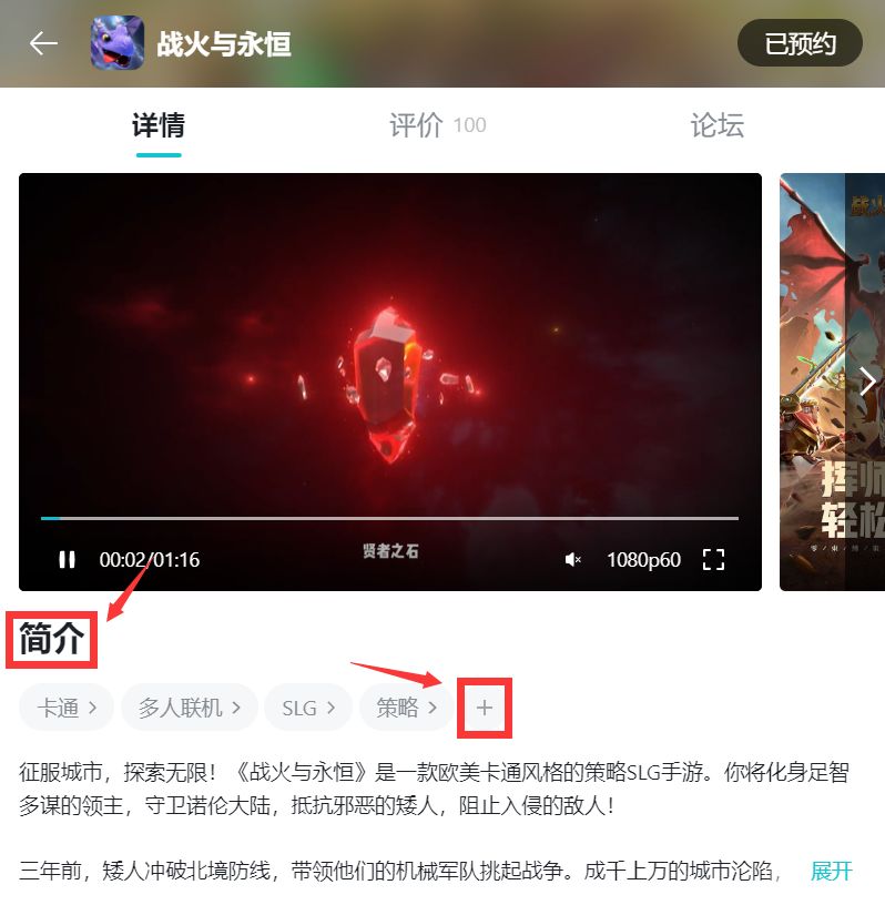 1.在《战火与永恒》详情页【简介】下方找到已有标签后的“+”号