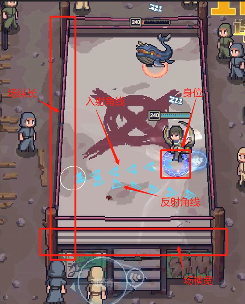 不装备减重等核心的情况下,月读在矿坑里的走位技巧:拉直指示器,横向发射会弹大约6个场地宽,最后回到发射前的位置附近,纵向发射大约弹3个纵长,往远端的墙发射,就会靠近远端的墙,利用这两个去控制自己的走位,另外如果是想远离一点点,那么指示器夹角不要太大,入射角线和反射角线贴在一起,角色会往反射角线方向移动大约1个身位。觉得抽象的看下图: