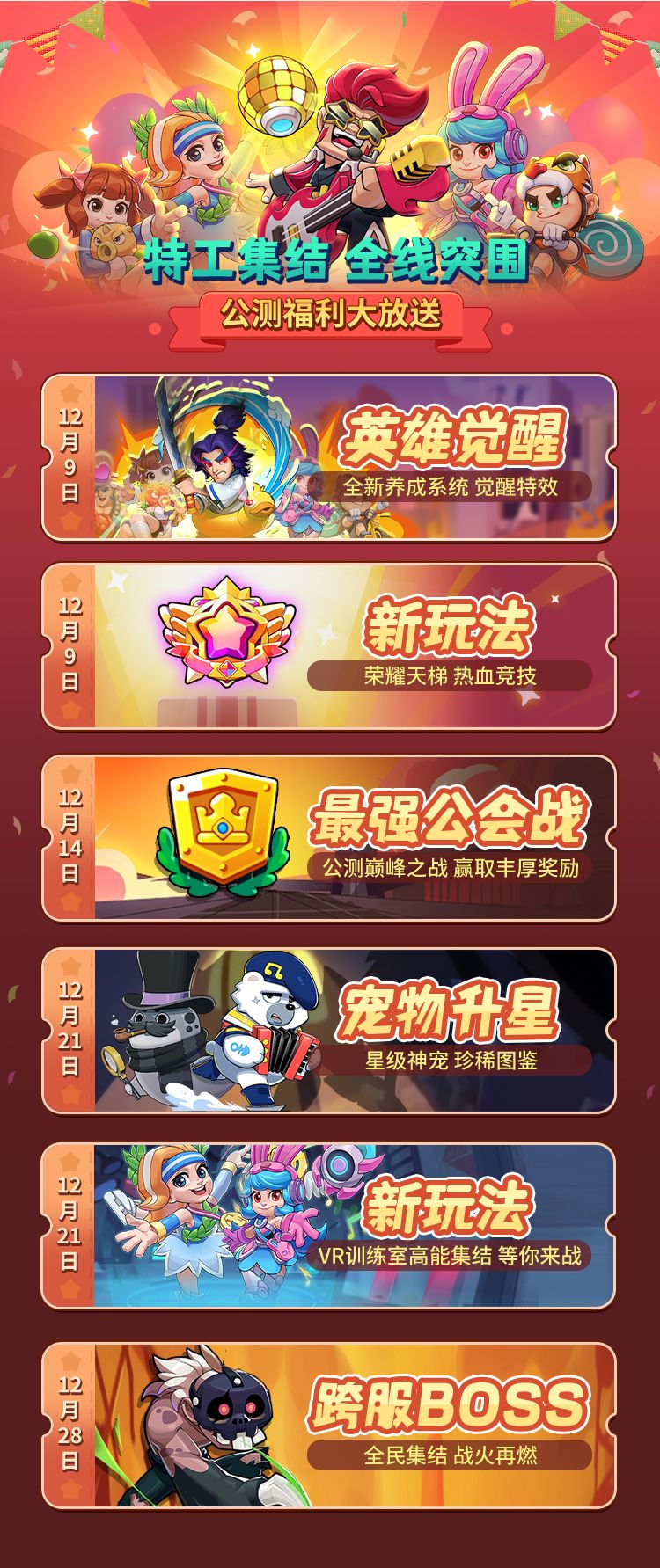 12月 9日-12月20日,火力全开关卡活动限时开启!关卡进度奖励每日刷新,可得狂欢券、SR碎片、SSR碎片等丰厚奖励!通关所有每日关卡共可得15张狂欢券,可免费兑换一个SSR英雄!(关卡进度每日刷新)