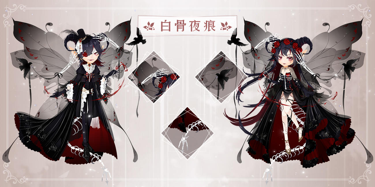 购买白骨夜痕套装赠送:夜痕长发(女)/夜痕短发(男)、夜痕礼服、夜痕红酒和“白骨夜痕”称号~