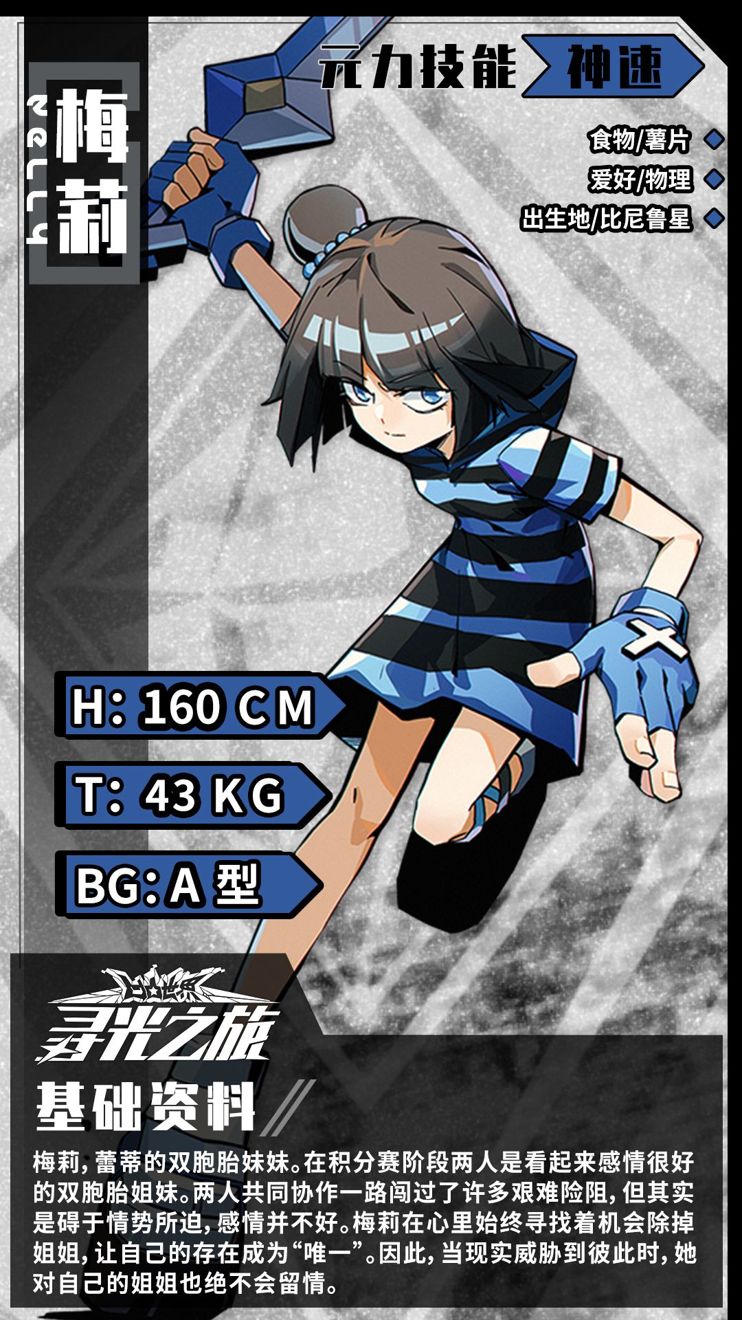 梅莉,蕾蒂的双胞胎妹妹。在积分赛阶段两人是看起来感情很好的双胞胎姐妹。两人共同协作一路闯过了许多艰难险阻,但其实是碍于情势所迫,感情并不好。梅莉在心里始终寻找着机会除掉姐姐,让自己的存在成为“唯一”。因此,当现实威胁到彼此时,她对自己的姐姐也绝不会留情。