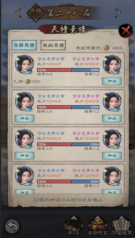 没入围的各位也别灰心,本次为各位看官新添了小彩头——竞猜,只有晋级赛可以竞猜哦,单队可以竞猜一次,需要消耗2W功勋,也可以同时竞猜多队,猜对获得4W功勋,错了可是会扣除功勋的,少主们在竞猜的时候可要慎重。