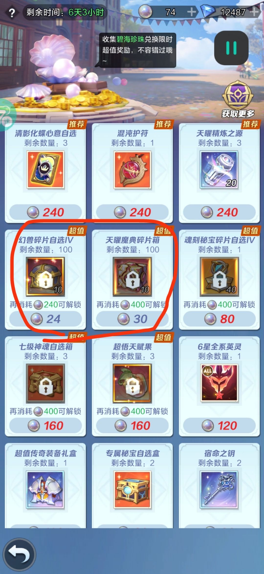 第二层建议换幻兽箱,天耀魔典超值买就好选择也更多(如果你刚好差20片做出苍穹/伊甸,那就换天耀魔典)