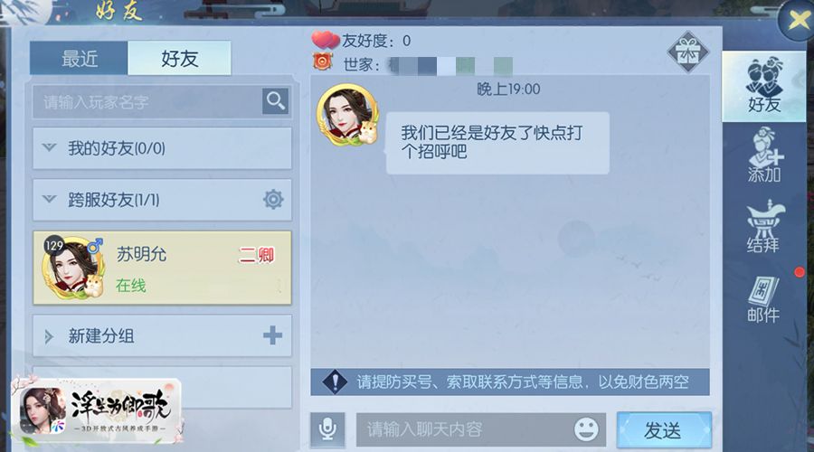 与自己的朋友、家人不在一个区,亦或者在跨服战斗中遇到了默契非常的队友,少了跨服系统,自然会抱有些许遗憾。如今,《浮生为卿歌》全新上线的“跨服交互”功能将打破服务器之间的束缚,阁下可在系统中看到跨服好友的当前战力、品阶以及服务器,并可以进行私聊、切磋等,交友互动更为便捷,真正实现如现实般唯美的古风人生。