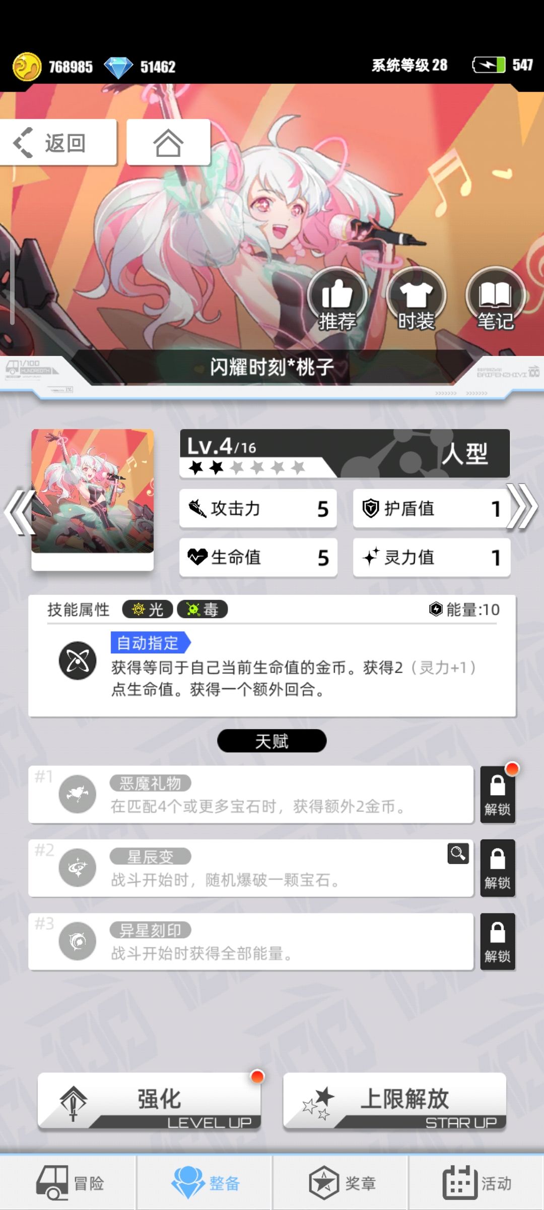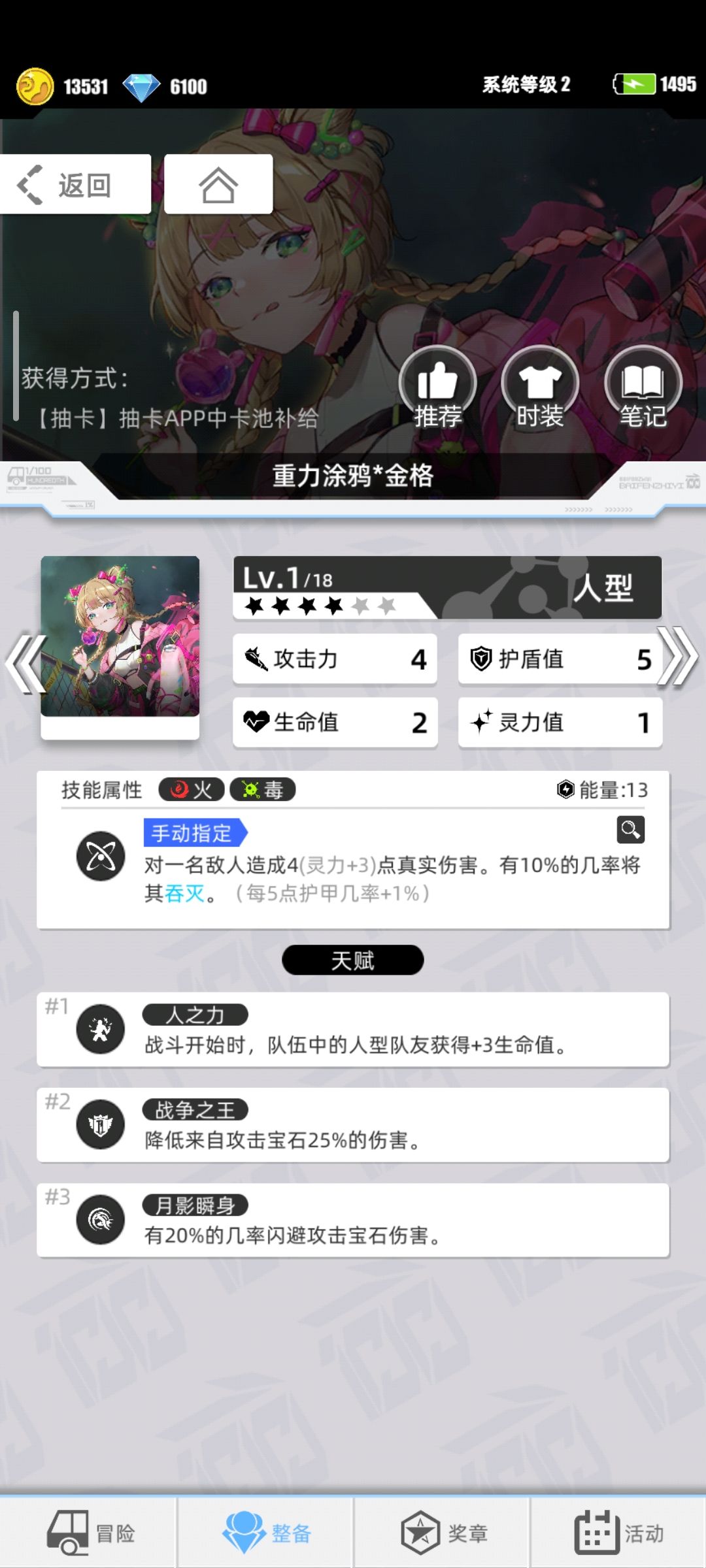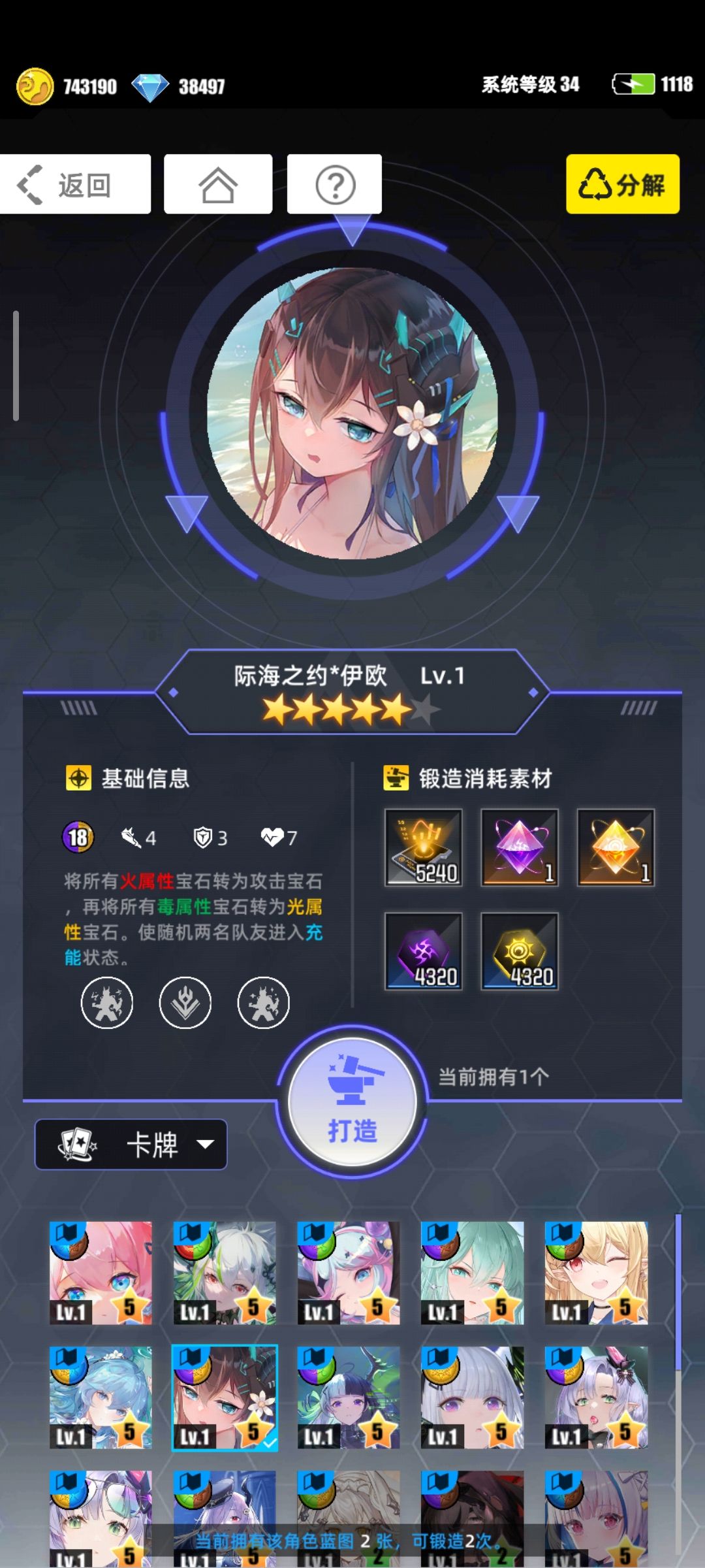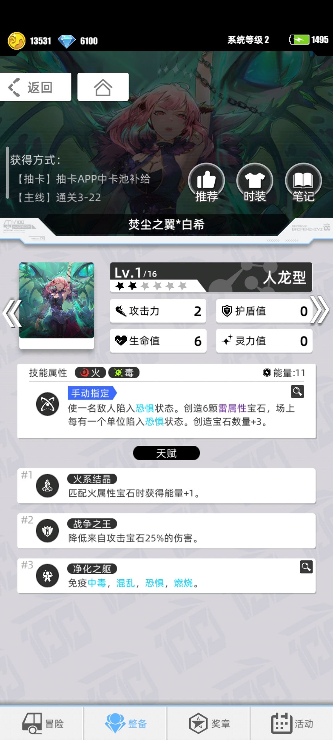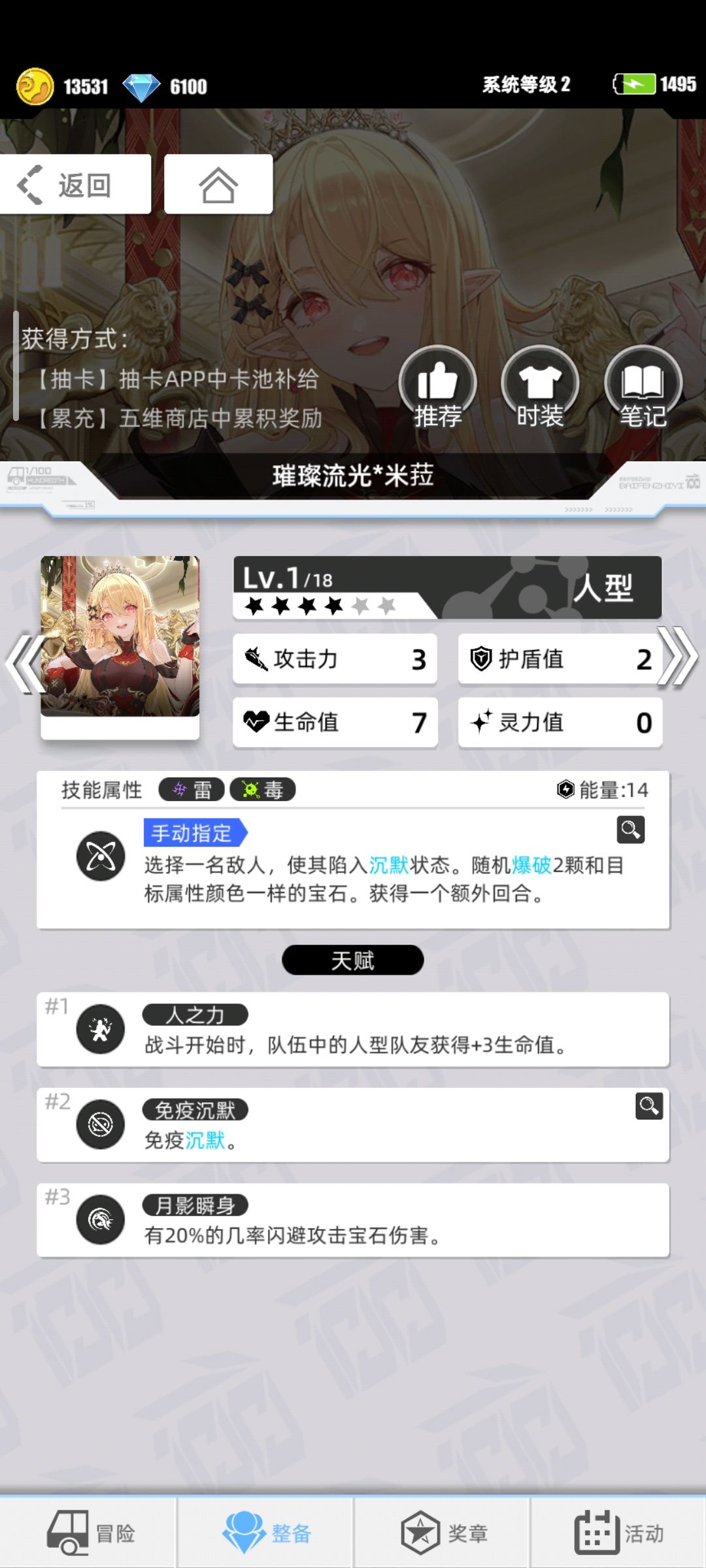 自然*奥丁(消耗电量活动轮换获得),全体伤害,场上火属性宝石越多,伤害越高,拥有至少12颗还能获得额外回合,满级拥有不俗的伤害,需要开启第三天赋