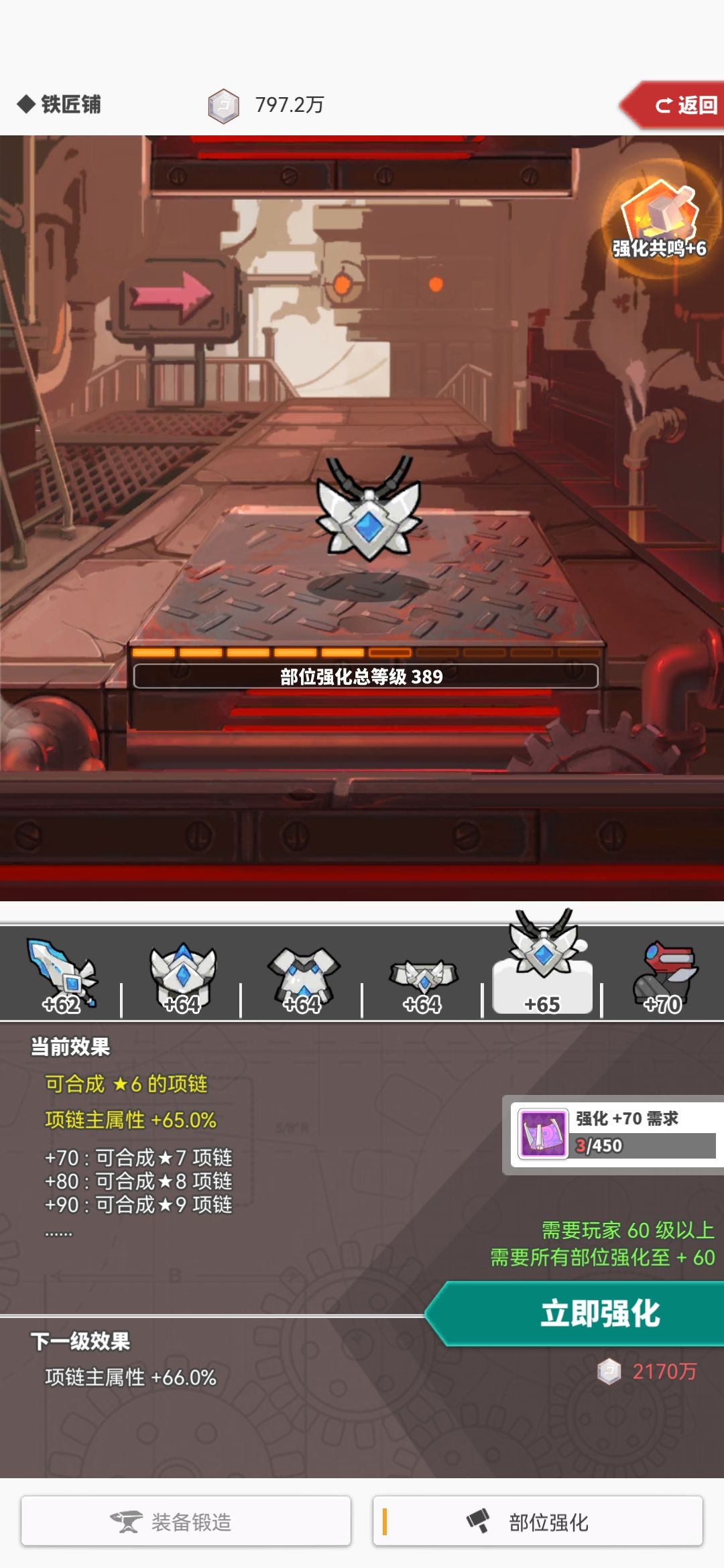玩家们可以通过强化功能来提升装备属性,每提升一级可以为对应装备提供百分之一的属性提升,且每当你六个部位都强化十级以及达到星级后还会获得装备共鸣属性(这个共鸣属性需要你使魔也穿戴一整套装备才会触发,且共鸣等级取该使魔穿戴装备最低星级例如:其他五件装备为4星但还有一件装备为三星则该使魔装备共鸣属性为三级共鸣属性)