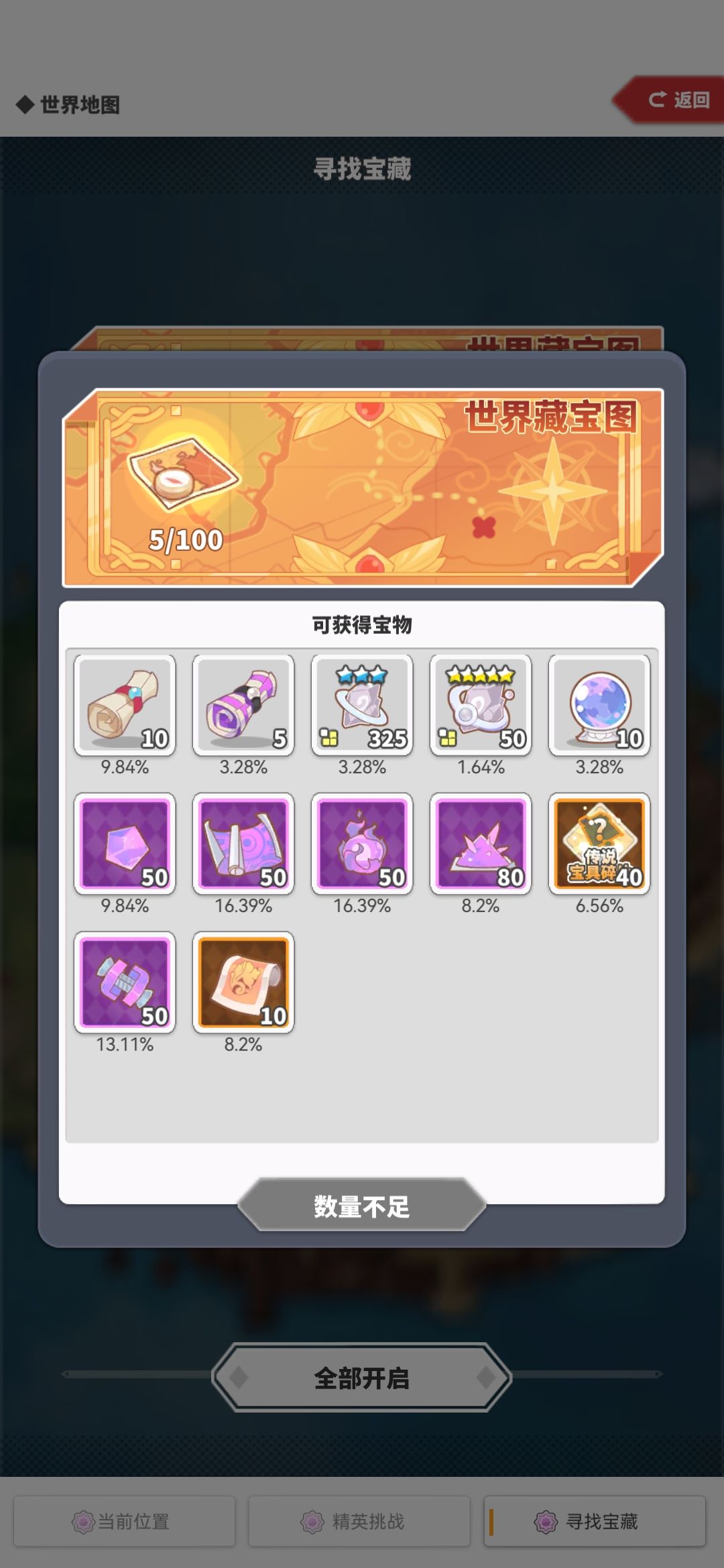 2藏宝图,开图也是可以获取随机宝具的,但橙色宝具只有世界藏宝图才有机会开出,藏宝图则是通过精英宝箱,通关回馈,以及通天塔回馈等等渠道获取