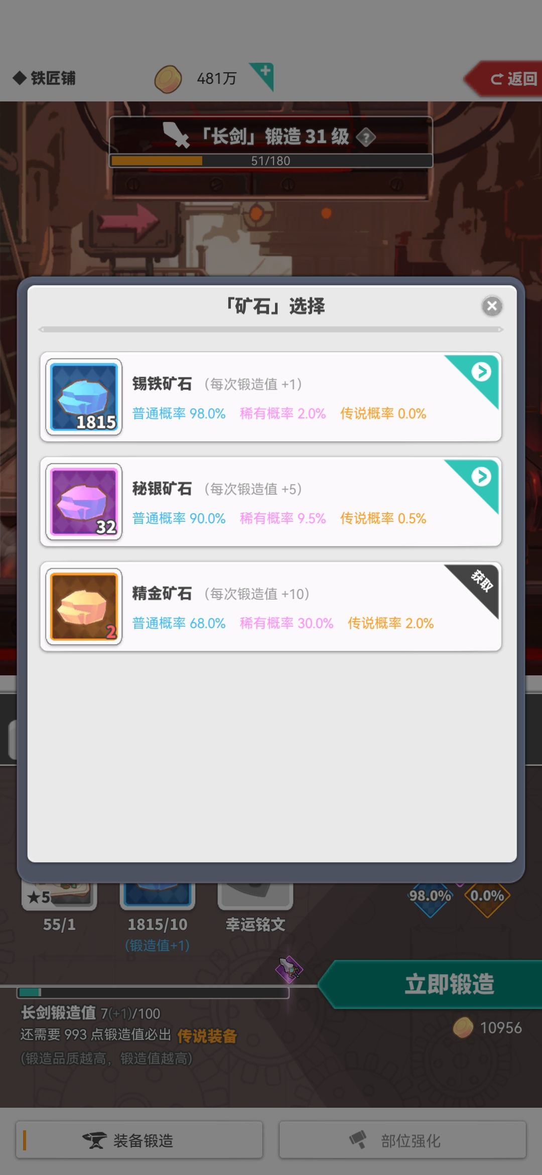 在铁匠铺进行装备锻造,锻造过程中可以试着加入不同的矿石以及铭文来提高获取高品质装备的概率