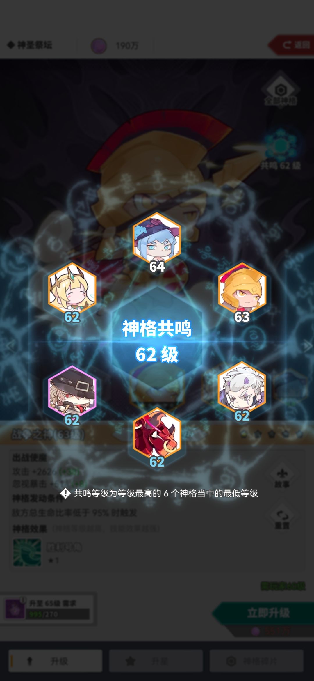 神格不仅仅在战斗中能提供大量输出以及辅助能力,在主城的神圣祭坛中给不同的神格升级还会给使魔提供不同的属性,且神格还拥有共鸣功能,既你只需要给6个神格进行升级,后续获得的其他神格也会随之提升到你培养的六个神格中的最低等级