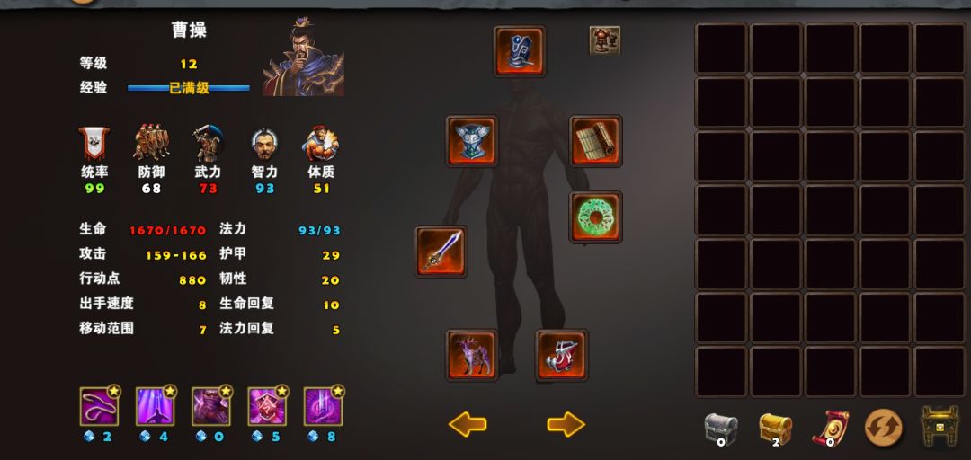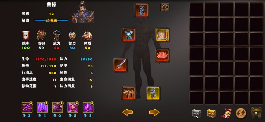 曹操:倚天剑(雌雄剑)、水镜头、百胜甲、幼麟鞋(戏法鞋)、木牛流马、吴子、莲花(和氏璧、五色石)
