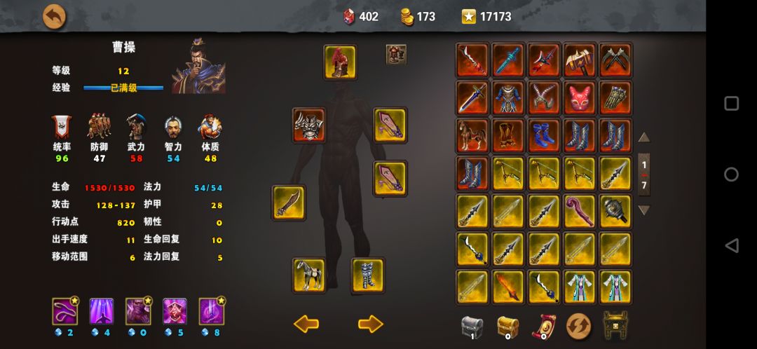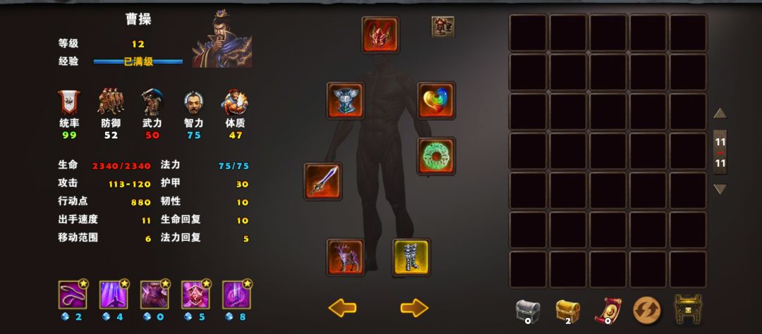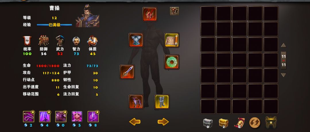 游戏推进到第六章以后这个时候红装都有一定的积累就可以开始做一个标准版的配装了,曹操佩戴倚天剑或者雌雄剑的情况下速度能够打到最低要求11就算合格。出装里有个五色石和紫金头那是部分副本需要高生命不然容易秒。紫金头是有些副本关卡很长在没有水镜头之前紫金头可以很好的节约蓝耗