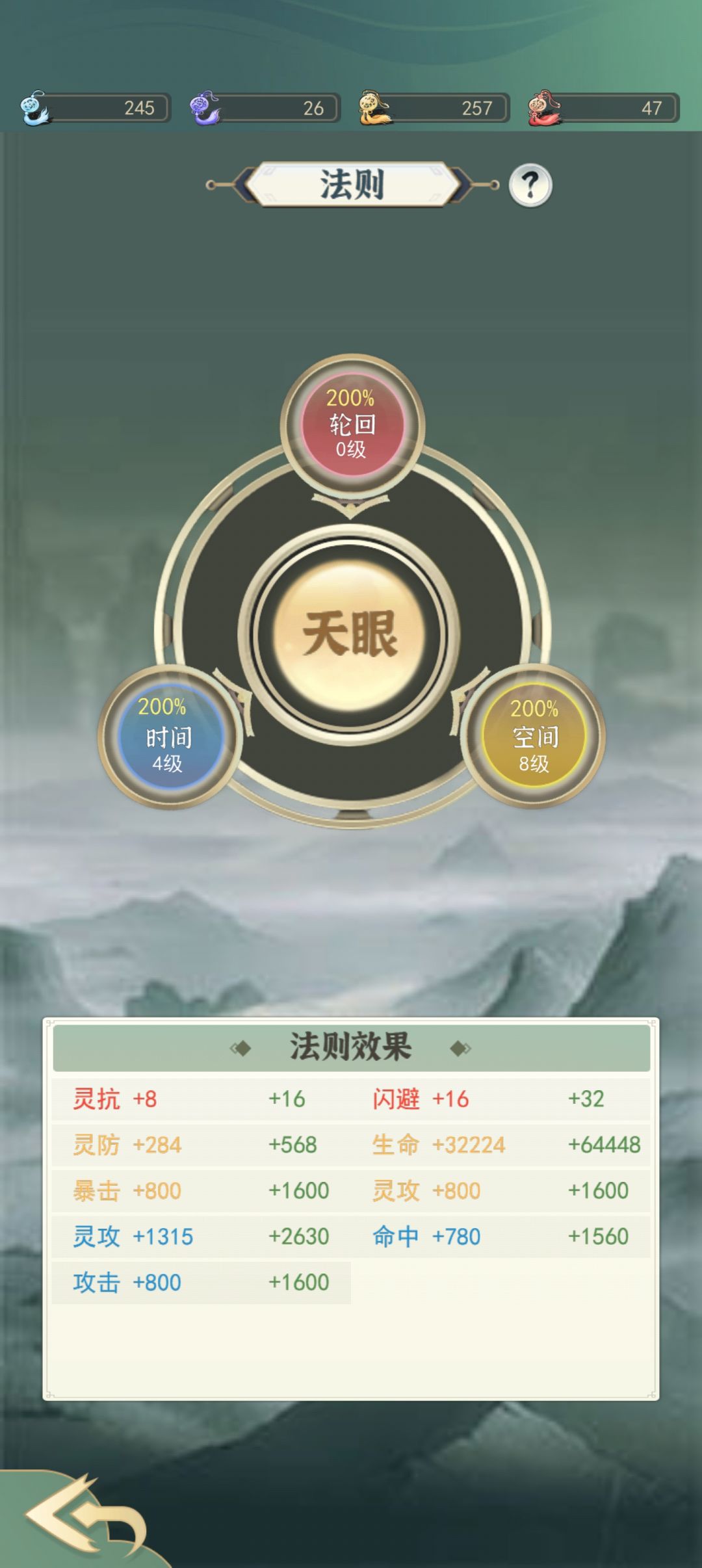 抢完后来升级法则,优先升级空间法则,灵防这个属性在前期带来的收益是很大的,其他都是毛毛雨。那个轮回的太贵了点不起