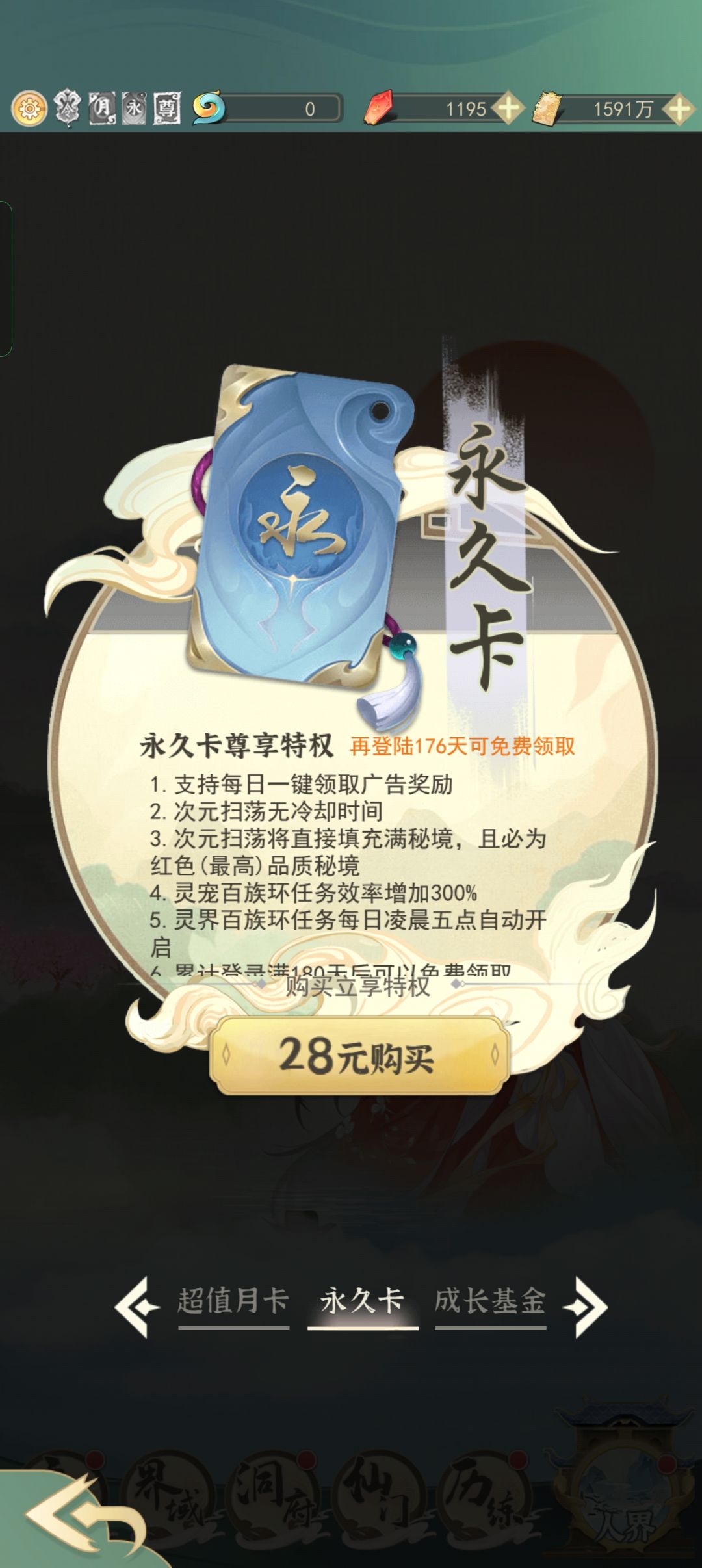 。tips:建议开通一个永久卡!性价比无敌。次元扫荡拥有永久卡体验直线提升,而且百族任务有时候也可以给不错的技能和法相。