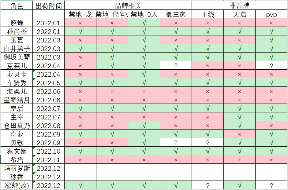 (根据评论修订贝歌, 真乃, 炮姐和改版后的貂蝉)