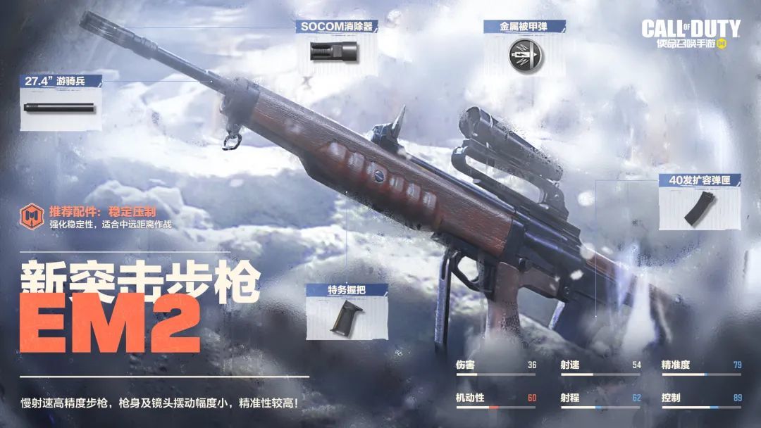 每一个瞄准能力极强的射手,都希望拥有一把精准度较高的武器,EM2将会是他们最好的选择之一。即将降临战场的EM2是一把自带瞄准镜的慢射速步枪,拥有较大的威力和较高的准确性,能让持有者在中远距离对枪中占据优势!
