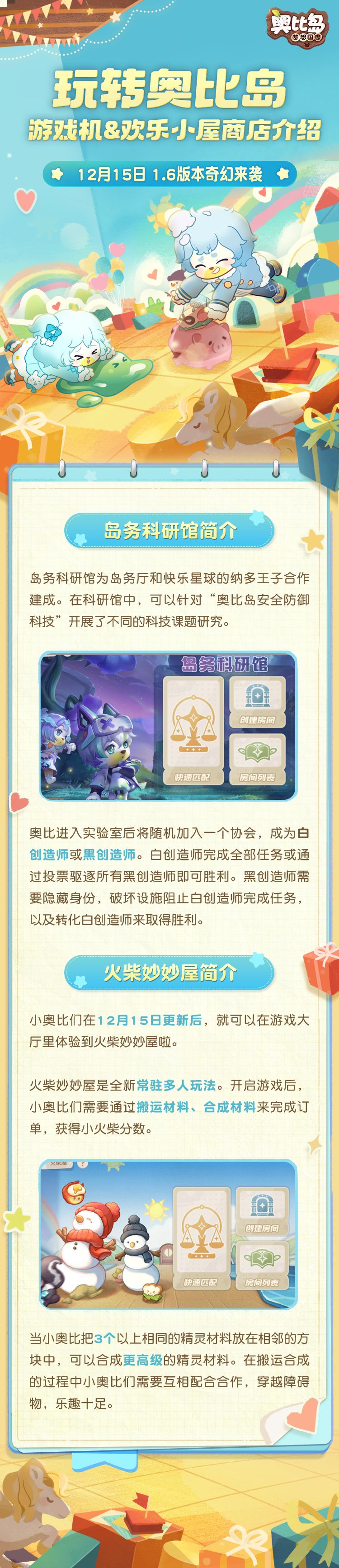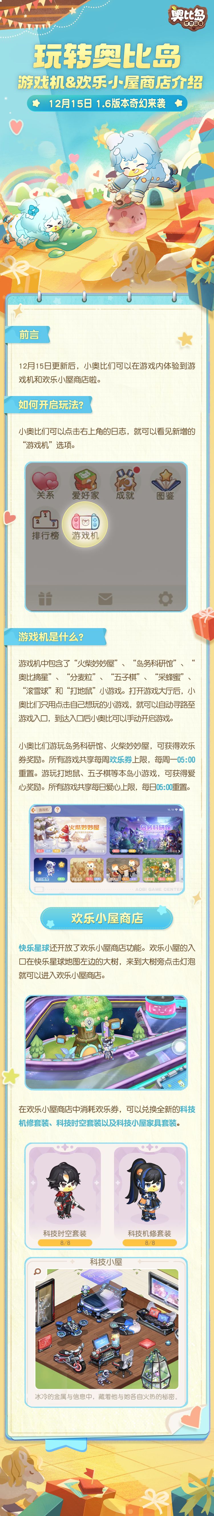 此外,可以直达所有小游戏的「游戏机」也将上线,奥比玩火柴妙妙屋、岛务科研馆获得欢乐券,可以前往「