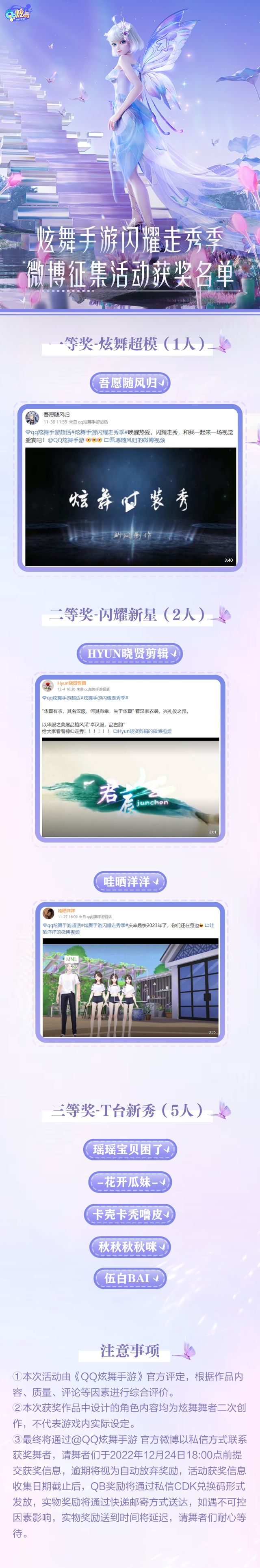 #炫舞手游闪耀走秀季#微博征集活动已经圆满结束,感谢各位小主人们对本次活动的支持,同时也感谢创作者们的耐心等待,经过官方评选,本次活动获奖名单如下↓