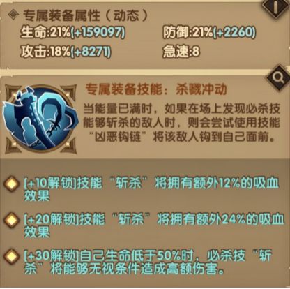 个人简评:解锁后的1级效果实战可以错位拉人,解锁效果还是不错的。10、20专武的效果提供了少量的续航能力,价值不高。30专武则是可以在敌人进斩杀线之前就能打出伤害,也一定成都上减少了能量溢出,但是与3家具的效果略有冲突,优先级不是特别高。不过专武的急速属性收益还是很高的,可以选择升级到以5结尾的等级。