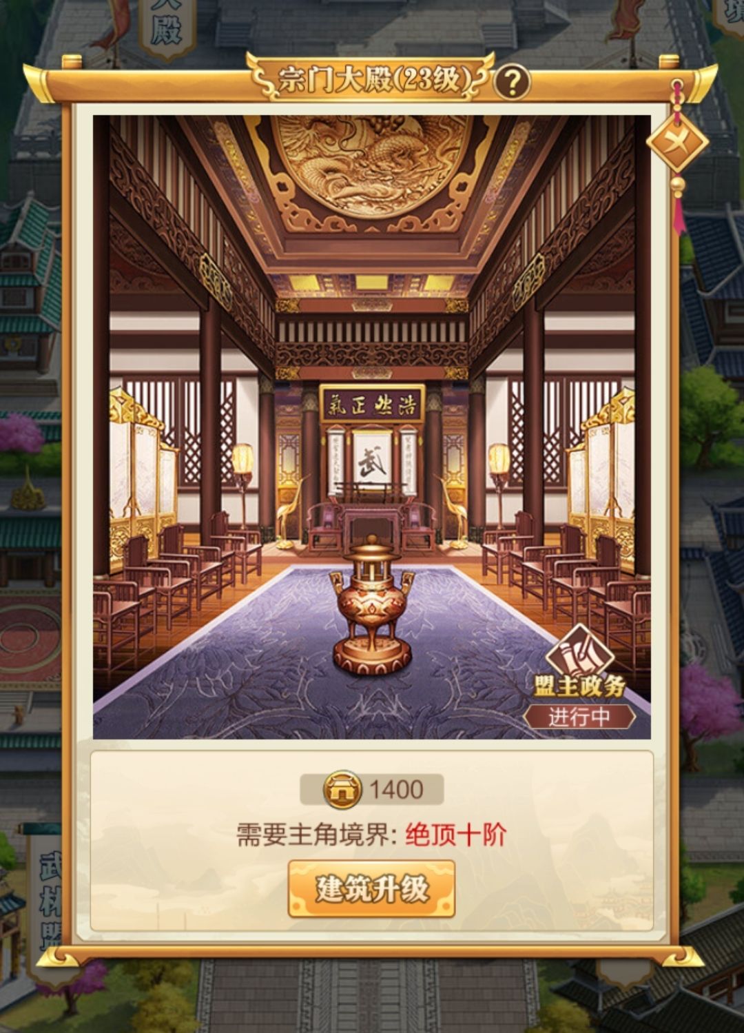 门派大殿:门派大殿是升级其他建筑的上限,而门派大殿的上限则是自身的境界,对于门派大殿的升级可以优先考虑,原因在于门派大殿可以提供宗门币和贡献,如果门派币不是特别富裕的大侠,可以根据其他建筑上限来适当升级门派大殿。