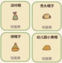 派对帽—带上派对帽就可以自由出入动物餐厅的所有派对,获取后可以得到15颗星,需要招待派对小狗15次和出售蒙布朗100份,秃头帽子—阿比到底是真秃还是带着帽子,这是一个问题,获取后可以得到15颗星,需要招待阿比30次,绿帽子—精灵头上的帽子,会给带上它的人带来好运气,获取后可以得到15颗星,需要招待绿帽子小精灵4次,幼儿园小黄帽—带上小黄帽,路上的大动物们都会给你让路哦!获取后可以得到15颗星,需要招待柴犬小宝35次。