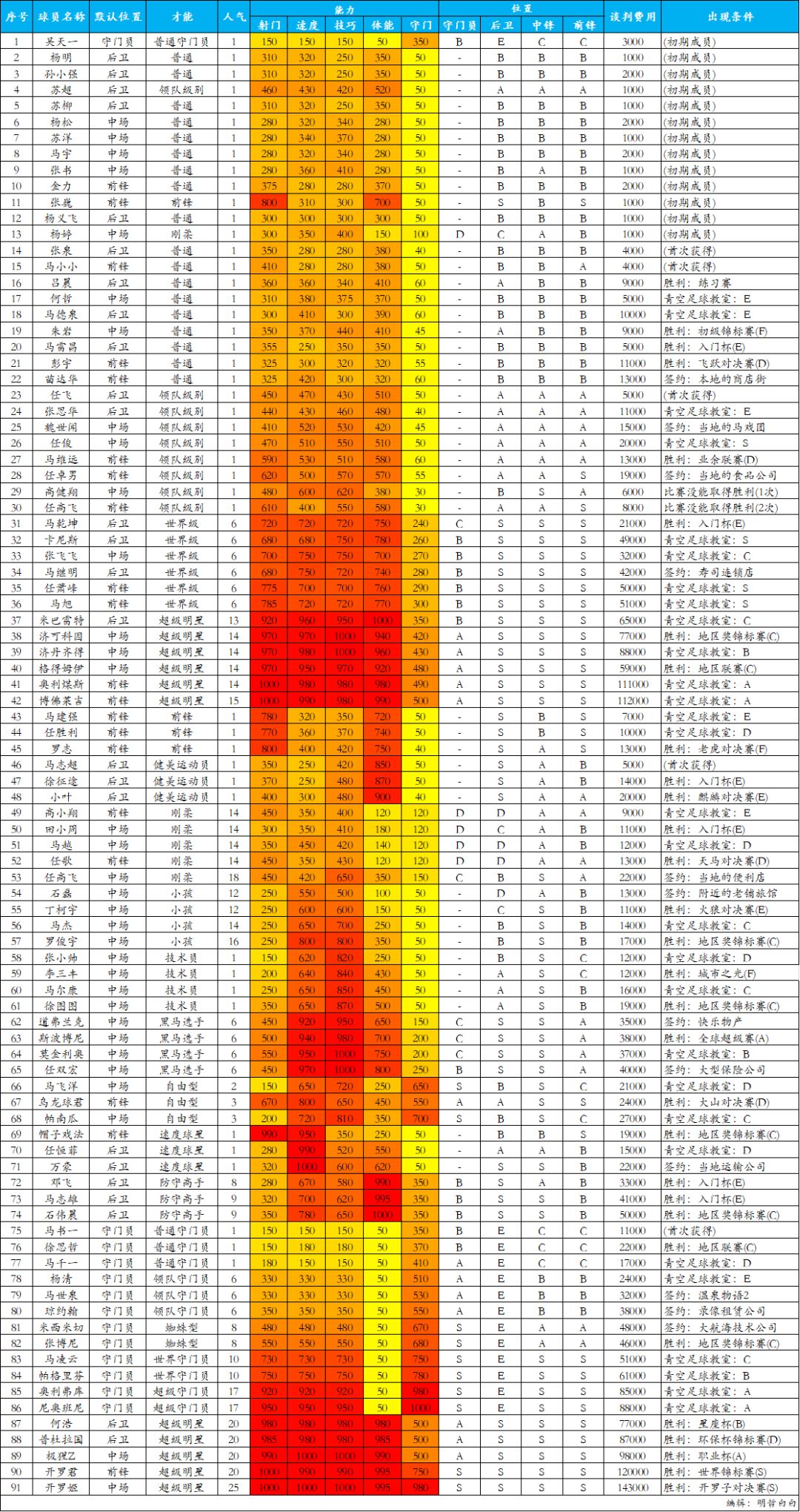 所有球员的能力已经用热力图显示出来,黄色代表低,红色代表高。