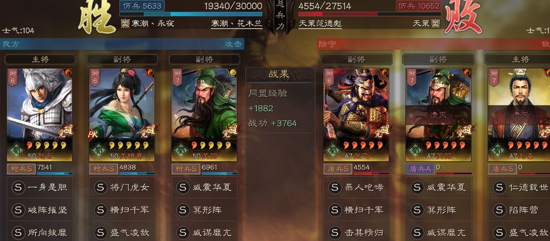 (主)关羽:盛气凌敌/箕形阵+威谋靡亢(副)关妹:盛气凌敌/箕形阵+横扫千军(副)赵云/魏延:破阵摧坚/绝其汲道/所向披靡