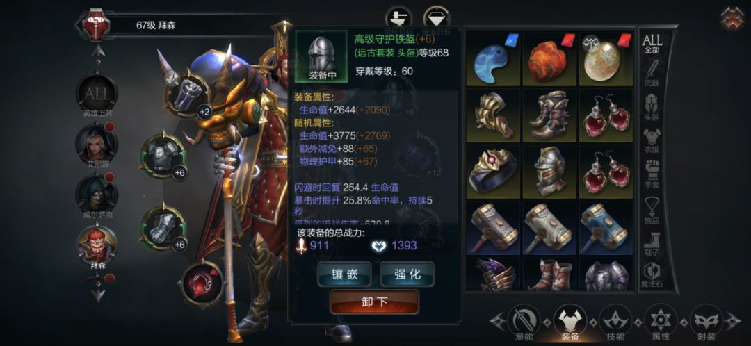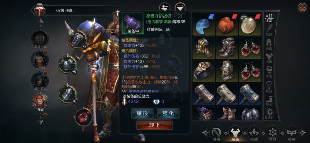 6、强化、强化这块对于我来说就是能强就强不能强就算了,我是一个赌狗,每日限时任务给的石头全拿去换箱子了(财务管的恩赐),因在不去交易买的情况下你想攒够30个去换100%+12的锤子需要30天,赌狗不可能等的。我运气还可以,用威信套的时候开了一个+12的锤子,现在守护套又开了一个+12的锤子。