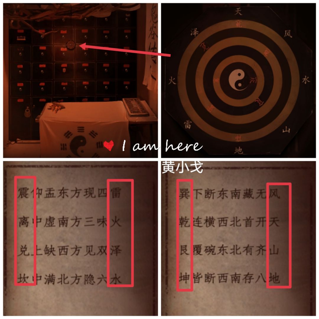 9.点击药材柜子上的八卦阵,根据【八卦口诀】上的线索,调整黄色的字(震→雷、离→火、兑→泽、坎→水、巽→风、乾→天、艮→山、坤→地),触发机关
